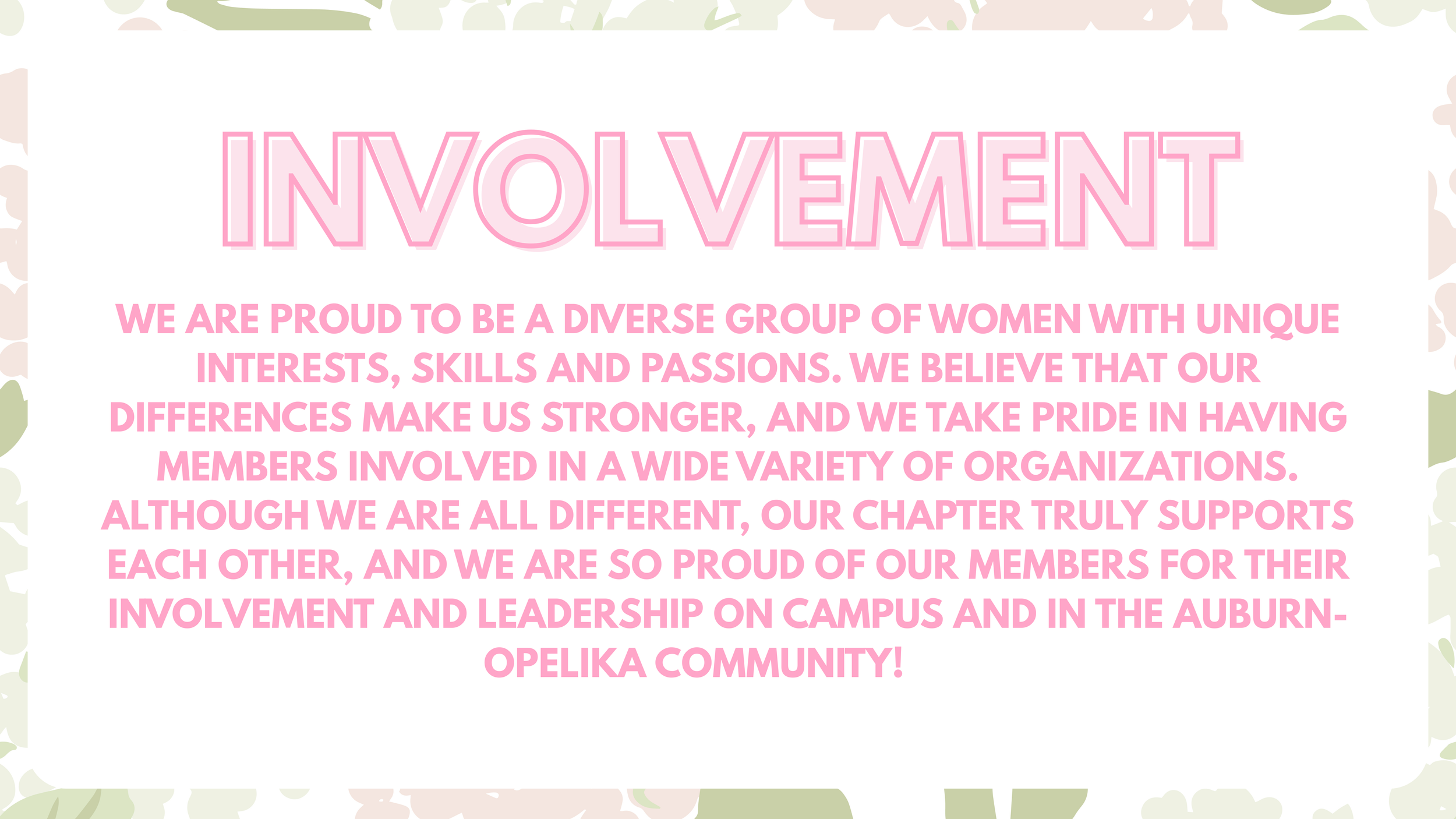 AUBURN SGA (SENATE, CABINET, JUDICIAL), FRESHMAN FORUM, LOBBY BOARD, TOP 5 MISS AUBURN, TOP 5 MISS HOMECOMING, WAR EAGLE GIRLS, STUDENT RECRUITERS, CAMP WAR EAGLE & SOS COUNSELORS, RECRUITMENT COUNSELORS (PI CHI’S), OMICRON DELTA KAPPA HONOR SOCIETY, PANHELLENIC EXECUTIVE BOARD, AUBURN GLOMERATA STAFF, THE OAKS RETREAT, PANHELLENIC CABINET AND REB, UNIVERSITY PROGRAM COUNCIL, EMERGE, CAMPUS KITCHENS, AUBURN WOMEN’S LACROSSE CLUB, MOCK TRIAL, NATIONAL SPEECH, LANGUAGE, AND HEARING ASSOCIATION, RHO LAMBDA HONOR SOCIETY, @AUBURNTIGERS OFFICIAL INSTAGRAM SOCIAL MEDIA MANAGER, DIAMOND DOLLS, HONORS CONGRESS, ATHLETIC RECRUITERS, EXECUTIVE STUDENT COUNCIL, DIRECTOR’S OF AUBIE, AND MORE!